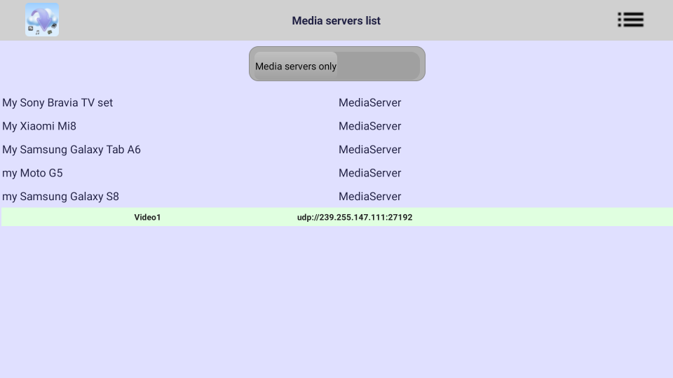 Pentru a porni un canal multicast necesită utilizarea unui client, pentru a accesa un server UPnP din rețeaua locală (Wi-Fi) cu suport FFmpeg. Acest server ar trebui să răspundă cu lista fișierelor pe care le exportă. Dacă acest server are suport FFmpeg, un text mic „Ca canal” trebuie afișat cu roșu la sfârșitul liniei de sus a paginii listei. Când textul este „roșu”, făcând clic pe butonul „redare” funcționează ca înainte folosind protocolul UPnP. Dacă dați clic pe text, acesta ar trebui să devină „verde” și făcând clic pe butonul „redare”, după selectarea fișierelor video sau audio, ar trebui să pornească un „canal”.